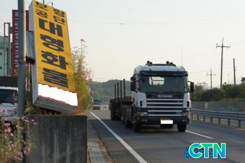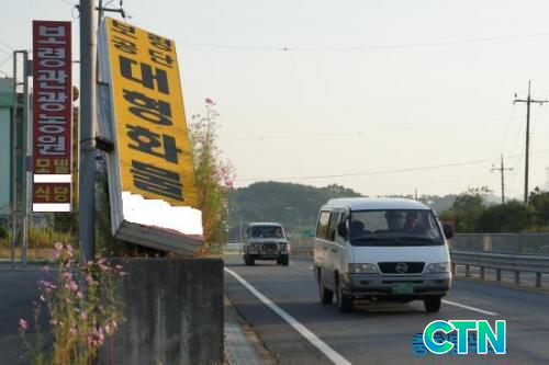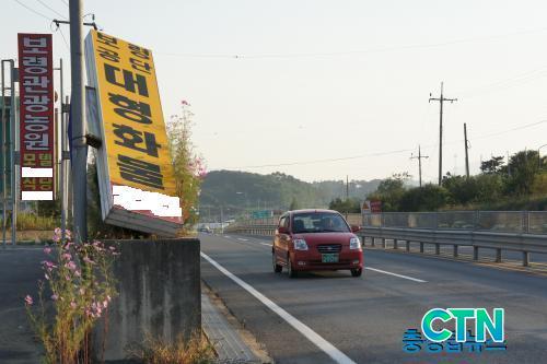 [º¸·É/ctn]±¹µµ 21È£ ¹Ù·Î¿·¿¡ ¼¼¿öÁø ÀÔ°£ÆÇÀº ¹Ù¶÷ÀÌ °ÇÏ°Ô ºÒ¸é µµ·ÎÀ§ÀÇ Â÷·®À» µ¤Ä¥ ÆÇÀÌ´Ù.