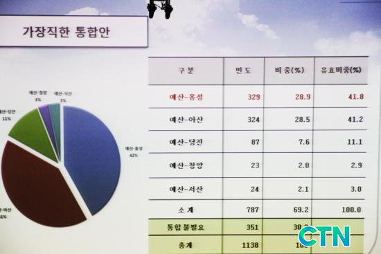 ÇàÁ¤±¸¿ª ÅëÇÕÁö¿ª ¼±È£µµ¿¡ ´ëÇÑ ¼³¹®Á¶»ç¿¡¼´Â ¿¹»ê-È«¼º 329¸í(41.8%), ¿¹»ê-¾Æ»ê324¸í(41.2%), ¿¹»ê-´çÁø 87¸í(11.1%)·Î ³ª¿Í È«¼º°ú ¾Æ»ê Áö¿ª ÅëÇÕÀǰßÀÌ ´ëµîÇÏ°Ô ³ªÅ¸³µ´Ù.