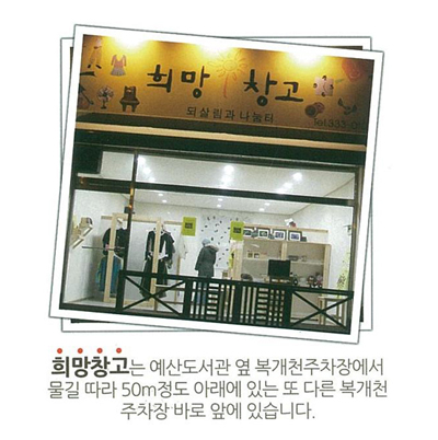 ¿¹»êÀ¾ ÁÖ±³¸® ȸÀü±³Â÷·Î¿¡¼ ¿¹»êÁßÇб³ ¹æÇâ ¹æÁױ濡 À§Ä¡ÇÑ 'Èñ¸Áâ°í'´Â °¢Á¾ »ýȰ¿ëǰµéÀ» ±âÁõ¹Þ¾Æ »õ ÁÖÀο¡°Ô ÀçÆÇ¸Å ÇØ ¼öÀͱÝÀ» ¿¬¸» ºÒ¿ìÀÌ¿ôµ½±â ¼º±ÝÀ¸·Î ±âŹÇÑ´Ù.