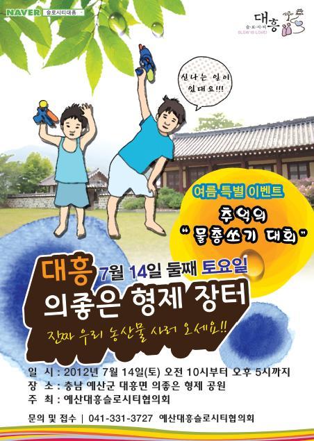 [¿¹»ê/ctn]¿¹»ê´ëÈï½½·Î½ÃƼÇùÀÇȸ(ȸÀå ÃÖµ¿Çå)°¡ ÁÖ°ü, ¸Å¿ù µÑ°ÁÖ Åä¿äÀÏ¿¡ ¿¸®°í ÀÖ´Â ´ëÈï ÀÇÁÁÀºÇüÁ¦ ÀåÅÍ¿¡¼ 7¿ù Ưº°À̺¥Æ®·Î ¡®Ãß¾ïÀÇ ¹°Ãѽî±â ´ëȸ¡¯¸¦ ÁغñÇÑ´Ù.
