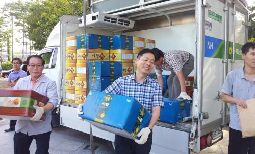 [¾Æ»ê/ctn]¾Æ»ê½Ã(½ÃÀå º¹±â¿Õ)´Â Áö³ 5ÀÏ ¾Æ»ê½Ãû º»°ü ¾Õ¿¡¼ 8¿ù ¸» ÅÂdz º¼¶óº¥°ú µ§ºóÀÇ ÇÇÇØ¸¦ ÀÔÀº °ú¼ö ³ó°¡¿Í ¾ÆÇÄÀ» ÇÔ²² Çϱâ À§ÇØ ¡°³«°ú ¹è¡± ÆÈ¾ÆÁÖ±â Çà»ç¸¦ ¾Æ»ê½Ã Àü Á÷¿øÀÌ Âü¿©Çß´Ù.