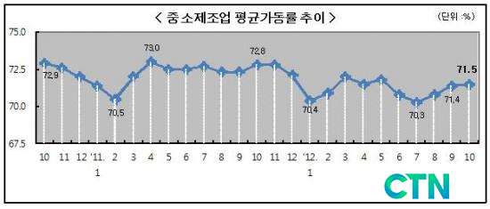 2012³â 10¿ù Áß¼ÒÁ¦Á¶¾÷ Æò±Õ°¡µ¿·üÀº Àü¿ù(71.4%)´ëºñ 0.1%p »ó½ÂÇÑ 71.5%·Î, Àü¿ùÀÇ ¼öÁØÀ» ±â·ÏÇß´Ù.