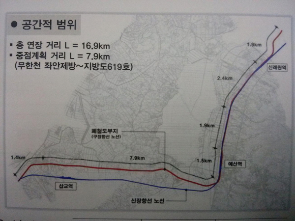 À̳¯ ÆóöµµºÎÁö Ȱ¿ë±¸°£Àº µµ½ÃÁö¿ª 7.7Km, ºñµµ½ÃÁö¿ª 9.2Km±¸°£ µî ÃÑ 16.9kmÀ̸ç ÀÌ °¡¿îµ¥ ¹«ÇÑõ Á¦¹æ¿¡¼ »ð±³Ãµ Á¦¹æ±îÁö 7.9Km ±¸°£À» ÁßÁ¡»ç¾÷±¸°£À¸·Î ¼³Á¤Çß´Ù.