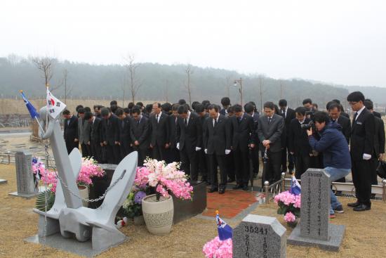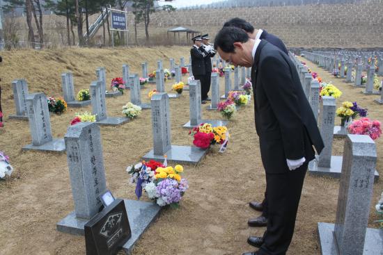À̳¯ Âü¼®ÀÚµéÀº ±¹°¡¸¦ À§ÇØ Èñ»ýµÈ À庴µéÀÇ ¼þ°íÇÑ Èñ»ýÁ¤½Å°ú ³ÌÀ» ±â¸£±â À§ÇØ ÇöÃæÅ¾¿¡¼ ÇåÈ ºÐÇâÇϰí, ÀÚ¸®¸¦ ¿Å°Ü ̀õ¾ÈÇÔ ¿ë»ç 3Áֱ⡦±×´ëµéÀ» ÀØÁö ¾Ê°Ú½À´Ï´Ù¡¯¶ó´Â ¼÷¿¬ÇÑ ¸¶À½À¸·Î õ¾ÈÇÔ 46¿ë»ç¿Í ÇÑÁÖÈ£ ÁØÀ§°¡ Àáµé¾î ÀÖ´Â ¹¦¿ª¿¡¼ Âü¹èÇÏ´Â ¼øÀ¸·Î ÁøÇàµÆ´Ù.