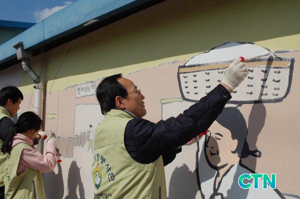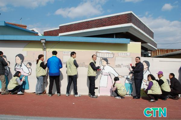 ºÀ»ç´Ü¿øµéÀº ¸¶À»±æÀ» µû¶ó À̾îÁø ´ãÀå°ú º® 400§³¿¡ ä»öÀÛ¾÷ ºÀ»çȰµ¿À» ½Ç½ÃÇß´Ù. À̵éÀÌ ±×¸° ¸¶À» º®È´Â ȸ»öÀÇ ÄÜÅ©¸®Æ®¸¦ È·ÁÇÑ »ö±ò·Î ¹Ù²ã »ç¶÷µéÀÇ ´«±æÀ» »ç·ÎÀâ¾Ò´Ù.