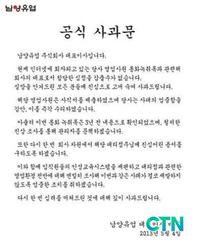 [°æÁ¦/ctn] Á¤Á¾ÀÏ ±âÀÚ = ³²¾çÀ¯¾÷ ¿µ¾÷¼ÒÀåÀÇ ¿å¼³°ú Æø¾ð ³»¿ëÀÌ ÆÄ¹®À» ÀÏÀ¸Å² °¡¿îµ¥ ȸ»ç ÃøÀÌ °ø½Ä »ç°ú¹®À» °ÔÀçÇßÁö¸¸ ÀÎÅͳݿ¡¼± ºÒ¸Å¿îµ¿±îÁö È®»êµÉ Á¶ÁüÀÌ´Ù.