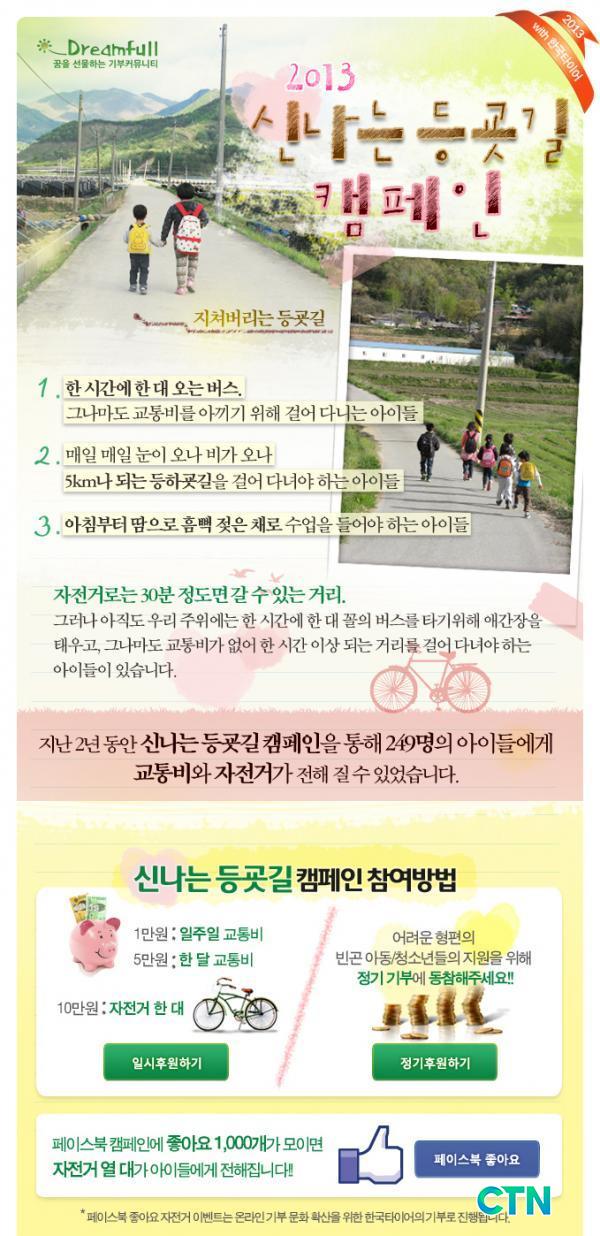 ¿Â¶óÀÎ ±âºÎ »çÀÌÆ® 'µå¸²Ç®(www.dreamfull.or.kr)'¿¡¼ Á÷Á¢ ±âºÎ±ÝÀ» ÈÄ¿øÇϰųª 'ºÎ½º·¯±â »ç¶û³ª´®È¸ ÆäÀ̽ººÏ(www.facebook.com/busrugy)'ÀÇ '2013 ½Å³ª´Â µî±·±æ Ä·ÆäÀÎ'Æ÷½ºÆ®¿¡ ´ëÇØ 'ÁÁ¾Æ¿ä'¸¦ ´·¯ Âü¿©ÇÒ ¼ö ÀÖ´Ù.