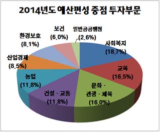 ¿ì¼±, 2014³âµµ ¿¹»êÆí¼º¿¡ ÀÖ¾î ÁßÁ¡ÀûÀ¸·Î ÅõÀÚÇØ¾ß ÇÒ ºÐ¾ß·Î´Â ¨ç »çȸº¹Áö(18.7%), ¨è ±³À°(16.5%), ¨é ¹®È°ü±¤Ã¼À°(16.0%), ¨ê °Ç¼³±³Åë(11.8), ¨ë ³ó¾÷(11.8%), ¨ì »ê¾÷°æÁ¦(8.5%), ¨í ȯ°æº¸È£(8.1%), ¨î º¸°Ç(6.0%), ¨ï ÀϹݰø°øÇàÁ¤(2.6%) ¼øÀ¸·Î ³ªÅ¸³µ´Ù.