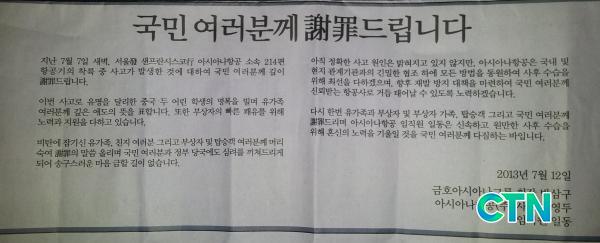 ½ÇÁ¦·Î ±ÝÈ£¾Æ½Ã¾Æ³ª±×·ì°ú ¾Æ½Ã¾Æ³ªÇ×°ø ÃøÀº Áö³ 12ÀÏ Áß¾Ó¾ð·Ð»ç¿Í °¢ Áö¹æ¾ð·Ð»ç¿¡ '±¹¹Î¿©·¯ºÐ²² »çÁ˵帳´Ï´Ù'¶ó´Â ±¤°í¸¦ °ÔÀçÇß´Ù.