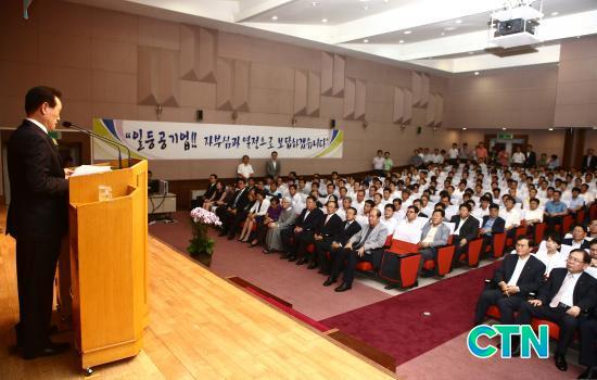 À̳¯ 400¿©¸íÀÇ ÀÓÁ÷¿øÀÌ Âü¼®ÇÑ ÀÌÀӽĿ¡¼ ¹Ú »çÀåÀº "¼ö¸®½Ã¼³ Çö´ëÈ, Çõ½Åµµ½Ã ÀÌÀü, ±¹Á¦°ü°³¹è¼öÀ§¿øÈ¸(ICID) ±¤ÁÖÃÑȸ °³ÃÖ µî ¿©·¯ Çö¾È°úÁ¦¸¦ ¼÷Á¦·Î ³²±â´Â ¸¸Å ÀÓÁ÷¿øµéÀÌ Àß ±Øº¹ÇØ ÁÖ±æ ¹Ù¶õ´Ù"°í µ¡ºÙ¿´´Ù.