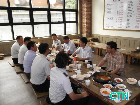 [¾Æ»ê/ctn]¾Æ»ê°æÂû¼(¼Àå ¼Á¤±Ç)´Â 7ÀÏ ¾Æ»ê½Ã ¿Â¾çµ¿ 00½Ä´ç¿¡¼ ¿Â¾çÁö±¸´ë ¼øÂû¿ä¿ø µî 15¸íÀÌ Âü¼®ÇÑ °¡¿îµ¥ Á¡½É½Ä»ç¸¦ ÇÔ²²Çϸç ÇöÀå±Ù¹«ÀÚµéÀÇ ³ë°í¸¦ Ä¡ÇÏ ÇÏ°í ¾Æ»ê ½Ã¹Îµé·ÎºÎÅÍ ½Å·Ú¿Í »ç¶û¹Þ´Â °æÂûÀÌ µÇ¾îÁÙ °ÍÀ» ´çºÎÇß´Ù.