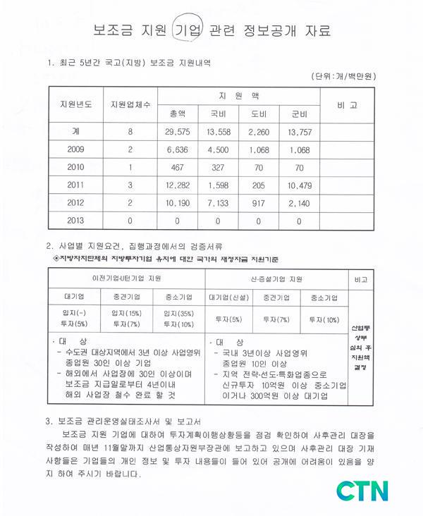 ÀÎÅͳÝÁ¾ÇÕ Àϰ£½Å¹® CTN(ÃæÃ»Å¾´º½º)Àº È«¼º±º¿¡ Áö³ 5³â°£ ±â¾÷¿¡ Áö¿øÇÑ ±¹°í¿Í Áö¹æºñ ³»¿ªÀ» °ø°³ÇÒ °ÍÀ» Á¤º¸°ø°³Ã»±¸ Çß´Ù.