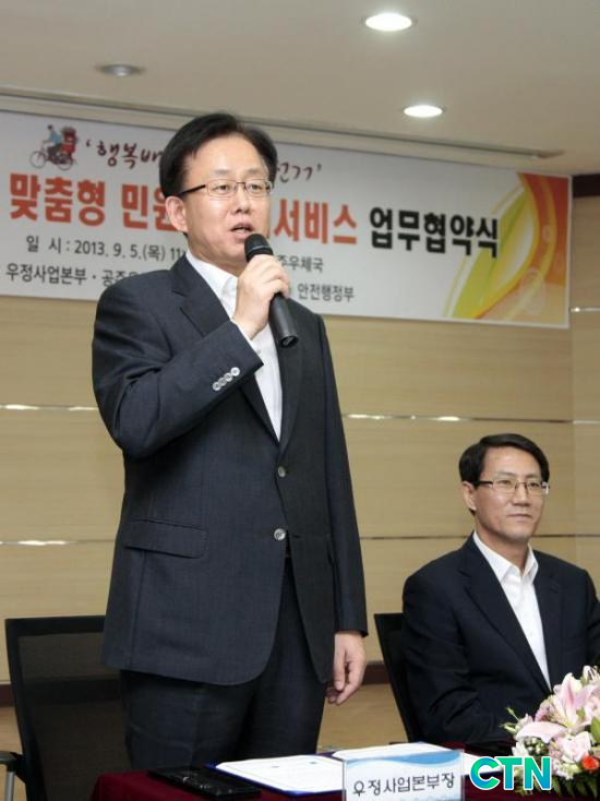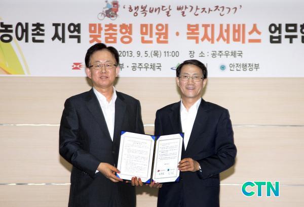 ¿ìÁ¤»ç¾÷º»ºÎ(º»ºÎÀå ±èÁØÈ£)¿Í ¾ÈÀüÇàÁ¤ºÎ(Àå°ü À¯Á¤º¹)´Â 5ÀÏ Ãæ³² °øÁÖ¿ìü±¹¿¡¼ ³ó¾îÃÌ ¹Î¿ø¡¤º¹Áö »ç°¢Áö´ë ÇØ¼Ò¸¦ À§ÇØ'Áý¹è¿øÀ» ÅëÇÑ ¸ÂÃãÇü ¹Î¿ø¡¤º¹Áö¼ºñ½º Á¦°ø'À» ³»¿ëÀ¸·Î ÇÏ´Â 'Çູ¹è´Þ »¡°£ÀÚÀü°Å'¾÷¹«Çù¾àÀ» ü°áÇßÀ¸¸ç, À̳¯ ÇÔ²² ½Ã¹ü±â°üÀ¸·Î ¼±Á¤µÈ °øÁÖ¿ìü±¹°ú °øÁֽõµ ¾÷¹«Çù¾àÀ» ü°áÇß´Ù.