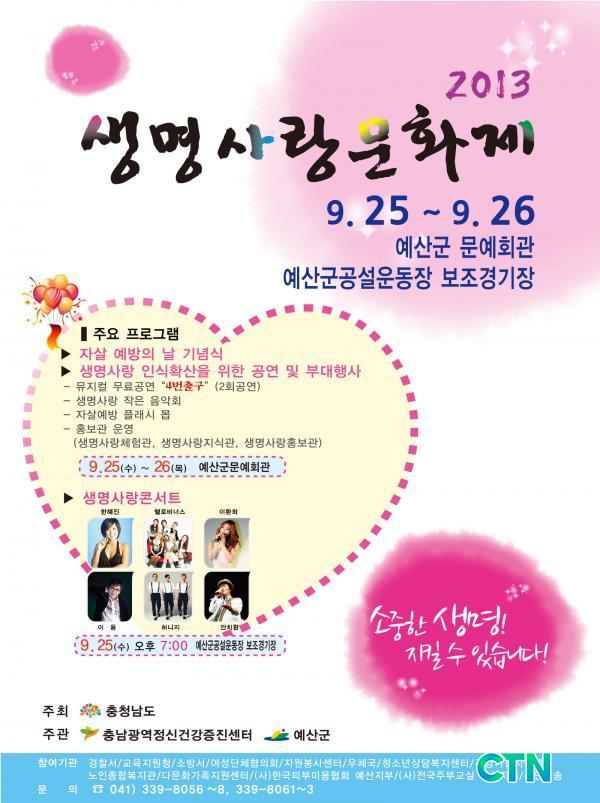 [¿¹»ê/ctn] ¿¹»ê±ºÀº ¼¼°è Àڻ쿹¹æÀÇ ³¯(9¿ù 10ÀÏ)À» ¸Â¾Æ Àڻ쿹¹æ¿¡ ´ëÇÑ Àνݳ¼± ¹× »ý¸í»ç¶û ¹®È È®»êÀ» À§ÇÑ ÃæÃ»³²µµ 2013 »ý¸í»ç¶û ¹®ÈÁ¦¸¦ ¿À´Â 25Àϰú 26ÀÏ ¾çÀϰ£ ¿¹»ê±º ¹®¿¹È¸°ü ¹× ¿¹»ê±º °ø¼³¿îµ¿Àå º¸Á¶°æ±âÀå¿¡¼ °³ÃÖÇÑ´Ù.