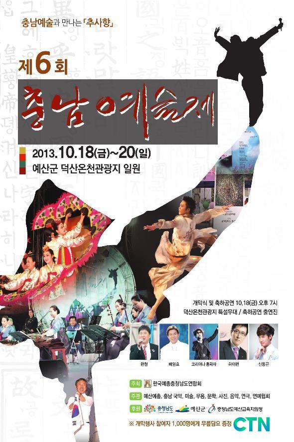 [¿¹»ê/ctn] ÃæÃ»³²µµ¿Í ¿¹»ê±ºÀÌ ÈÄ¿øÇϰí Çѱ¹¿¹ÃÑÃæÃ»³²µµ¿¬ÇÕȸ(ȸÀå À±¼ºÈñ)°¡ ÁÖÃÖÇÏ´Â Á¦6ȸ Ãæ³²¿¹¼úÁ¦°¡ ¿À´Â 18ÀϺÎÅÍ 20ÀϱîÁö 3Àϰ£ ¿¹»ê±º ´ö»ê¿Âõ°ü±¤Áö ÀÏ¿ø¿¡¼ ´Ùä·Ó°Ô ÆîÃÄÁø´Ù.