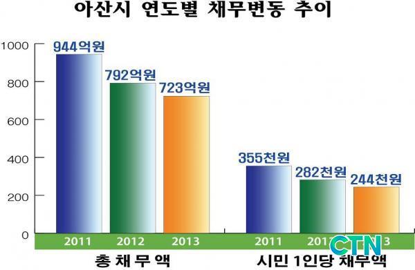 Áö¹æÃ¤¹« °¨¼Ò Ãß¼¼´Â 2013³â¿¡µµ À̾îÁ® ±Ý³â 9¿ù ÇöÀç ¾Æ»ê½ÃÀÇ Ã¤¹«¾×Àº 723¾ï ¿ø, ½Ã¹Î 1Àδç 乫¾×Àº 244õ ¿øÀ¸·Î, Áö³ 2011³â ´ëºñ 乫¾×Àº 23%(221¾ï ¿ø), ½Ã¹Î 1Àδç 乫¾×Àº 31%(111õ ¿ø) °¢°¢ °¨¼ÒÇÏ´Â µî Áö¹æÀçÁ¤ÀÌ Áö¼ÓÀûÀ¸·Î ¾ÈÁ¤µÇ°í ÀÖ´Ù.