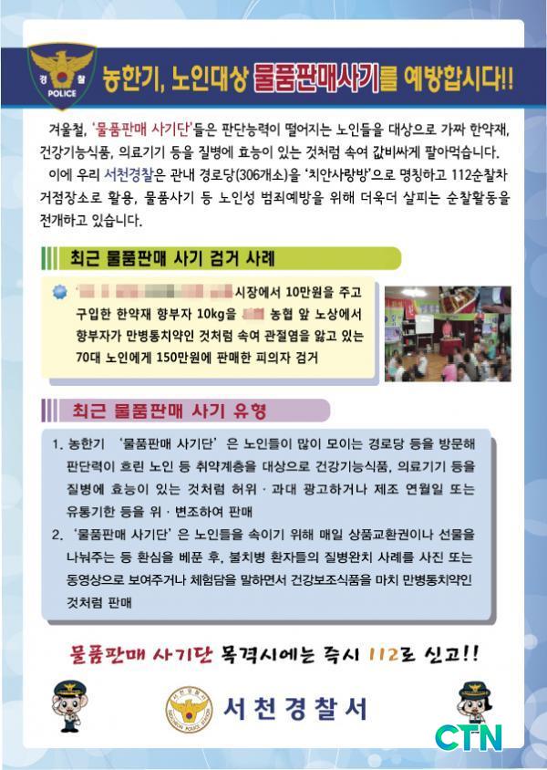 [¼Ãµ/ctn]Ãæ³² ¼Ãµ°æÂû¼(¼Àå Àå±Ç¿µ)´Â ¼öÈ®À» ³¡³»°í ÀϼÕÀÌ Àû¾îÁö´Â °Ü¿ïö, °æ·Î´ç µî¿¡¼ ¹«·áÇÏ°Ô ½Ã°£À» º¸³»´Â ³ëÀεéÀ» ´ë»óÀ¸·Î °Ç°±â´É½Äǰ µîÀ» ºÒ¹ýÀûÀ¸·Î ÆÇ¸ÅÇÏ´Â '¹°Ç°ÆÇ¸Å »ç±â' ÇÇÇØ ¿¹¹æÀ» À§ÇØ ÃÑ·ÂÀ» ±â¿ïÀÎ´Ù°í ¹àÇû´Ù.