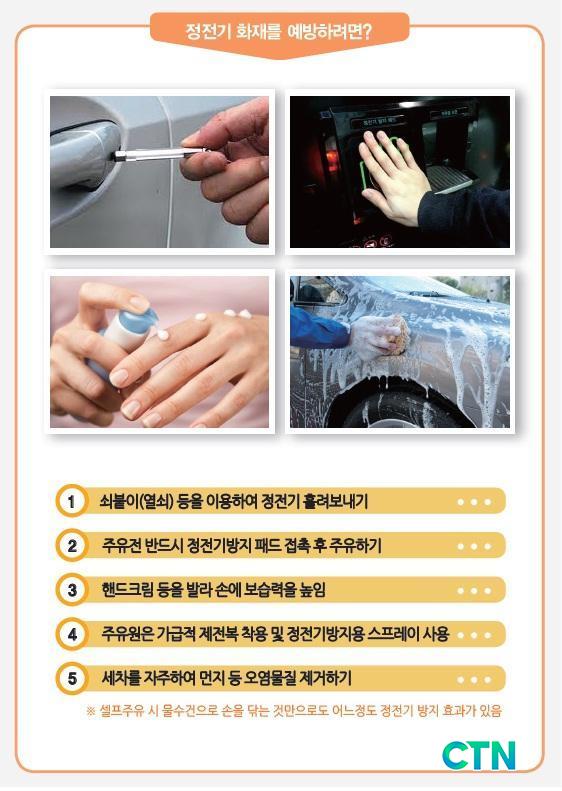 ÀÌ·± ÁÖÀ¯Ãë±Þ¼Ò Á¤Àü±â¸¦ ¿¹¹æÇϱâ À§Çؼ´Â ¡ã¼èºÙÀÌ(¿¼è) µîÀ» ÀÌ¿ëÇØ Á¤Àü±â Èê·Áº¸³»±â ¡ãÁÖÀ¯Àü ¹Ýµå½Ã Á¤Àü±â ¹æÁö ÆÐµå Á¢ÃË ÈÄ ÁÖÀ¯Çϱ⠡ãÇÚµåÅ©¸² µîÀ» ¹ß¶ó ¼Õ¿¡ º¸½À·ÂÀ» ³ôÀÓ ¡ãÁÖÀ¯¿øÀº °¡±ÞÀû Á¦Àüº¹ Âø¿ë ¹× Á¤Àü±â¹æÁö¿ë ½ºÇÁ·¹ÀÌ »ç¿ë ¡ã¼¼Â÷¸¦ ÀÚÁÖÇØ ¸ÕÁö µî ¿À¿°¹°Áú Á¦°Å µî ÁÖÀ¯ ¾ÈÀü¼öÄ¢À» ÁؼöÇØ¾ß ÇÑ´Ù.