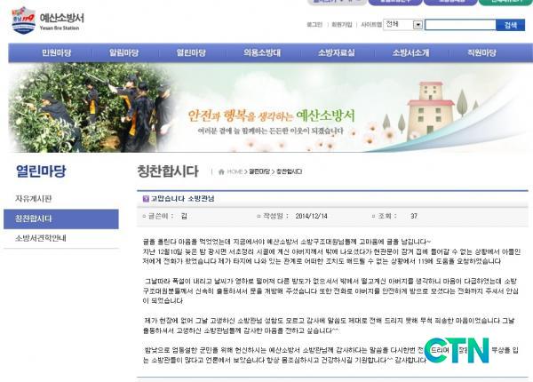 [¿¹»ê/ctn] ¿À¼öȯ ±âÀÚ = ¿¹»ê¼Ò¹æ¼(¼Àå ±è°æÈ£) ȨÆäÀÌÁö ĪÂùÇսô٠°Ô½ÃÆÇ¿¡ "°í¸¿½À´Ï´Ù! ¼Ò¹æ°ü´Ô" À̶ó´Â ±ÛÀÌ °Ô½ÃµÇ¾î, ¼Ò¹æ°ø¹«¿øµéÀÇ ¸¶À½À» µû¶æÇÏ°Ô Çß´Ù.