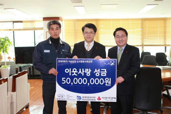 [¾Æ»ê/ctn]ÇѼºÁø ±âÀÚ = Çö´ëÀÚµ¿Â÷¢ß¾Æ»ê°øÀå(°øÀåÀå ÀÌ»óÈÆ Àü¹«)ÀÌ Áö¿ª º¹Áö Çâ»óÀ» À§ÇØ Áö³ 22ÀÏ ¾Æ»ê½Ã¸¦ ã¾Æ 'Èñ¸Á2015 ³ª´®Ä·ÆäÀÎ' ÀÌ¿ô»ç¶û ¼º±ÝÀ¸·Î 50,000õ ¿øÀ» Àü´ÞÇß´Ù.