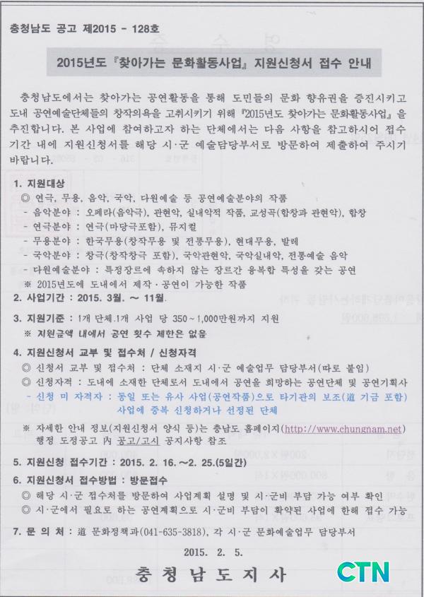 [Ãæ³²/ctn]ÀüÀÎö ±âÀÚ/°¡±ÝÇö ±âÀÚ = 2015 ÃæÃ»³²µµ ã¾Æ°¡´Â ¹®È Ȱµ¿ °ø¸ð»ç¾÷À» ÁøÇàÇÏ¸é¼ ÃæÃ»³²µµ¿Í ¼»ê½Ã°¡ »ç¾÷ÁøÇà°ú »ç¾÷ºñ Ã¥Á¤ ¹®Á¦¸¦ ³õ°í ¼·Î Ã¥ÀÓ Àü°¡¸¦ Çϰí ÀÖ¾î Áö¿ª ¹®È ¿¹¼ú ´ÜüµéÀÌ È²´çÇÔÀ» °Þ°í ÀÖ´Ù.