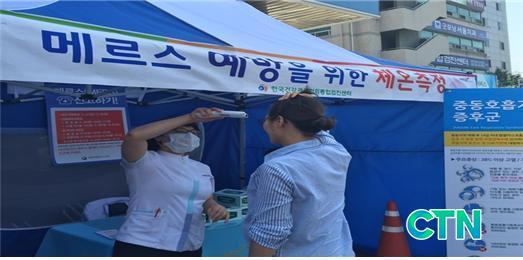 û»ç ¿ÜºÎÀÇ º°µµ °ø°£¿¡¼ û»ç ÃâÀÔ Àü ÀÇ·áÁøÀ» ºñ·ÔÇÑ Á÷¿ø, ¹æ¹®°´ÀÇ ¼Õ ¼Òµ¶°ú ¹ß¿ ¹× È£Èí±â Áõ»óÀ» È®ÀÎÇÏ´Â ÇÑÆí, ½Å¿øÀ» È®ÀÎÇÏ¿© ¸Þ¸£½º °ü·ÃÀÚ¿ÍÀÇ Á¢ÃËÀ» »çÀü¿¡ ¸·°í ÀÖ´Ù.