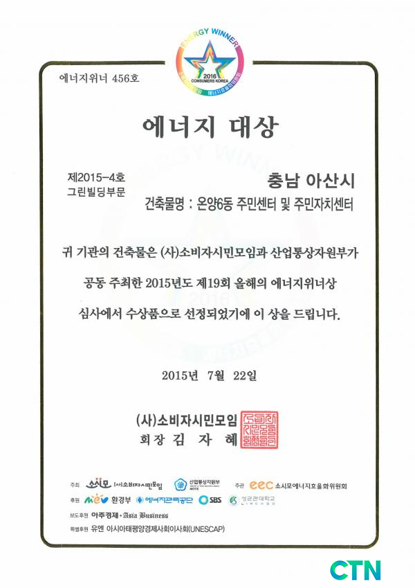 [¾Æ»ê/ctn]ÇѼºÁø ±âÀÚ = ¾Æ»ê½Ã´Â Áö³ 22ÀÏ ¼¿ï »ï¼ºµ¿ ÄÚ¿¢½º¿¡¼ ¿¸° 'Á¦19ȸ ¿ÃÇØÀÇ ¿¡³ÊÁöÀ§³Ê»ó' ½Ã»ó½Ä¿¡¼ ¿Â¾ç6µ¿ Áֹμ¾ÅÍ ¹× ÁÖ¹ÎÀÚÄ¡¼¾ÅͰ¡ ¿¡³ÊÁö ´ë»ó °ÇÃ๰ ºÎ¹®¿¡ ¼±Á¤µÅ UNESCAP »ç¹«ÃÑÀå»óÀ» ¼ö»óÇß´Ù°í ¹àÇû´Ù.
