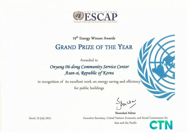 ¾Æ»ê½Ã ¿Â¾ç6µ¿ ÁÖ¹ÎÀÚÄ¡¼¾ÅÍ, UNESCAP »ç¹«ÃÑÀå»ó ¼ö»ó