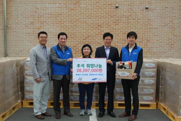 [¾Æ»ê/ctn]ÇѼºÁø ±âÀÚ = »ï¼ºÀüÀÚ ¿Â¾çÄ·ÆÛ½º »çȸºÀ»ç´ÜÀå´Â Ãß¼® ¸íÀýÀ» ¸Â¾Æ Áö³ 24ÀÏ ¹è¹æÀ¾ ÇູŰ¿òÃßÁø´Ü(´ÜÀå ¿Àº´±¹)À» ã¾Æ Áö¿ªÀÇ ¾î·Á¿î ÀÌ¿ôÀ» À§ÇØ »ýÇÊǰ 430¼¼Æ® ¹× °á¿¬ºÀ»çó 26°³¼Ò¿¡ »ýÇÊǰ 400¼¼Æ®(2,600¸¸¿ø »ó´ç)¸¦ Àü´ÞÇß´Ù.