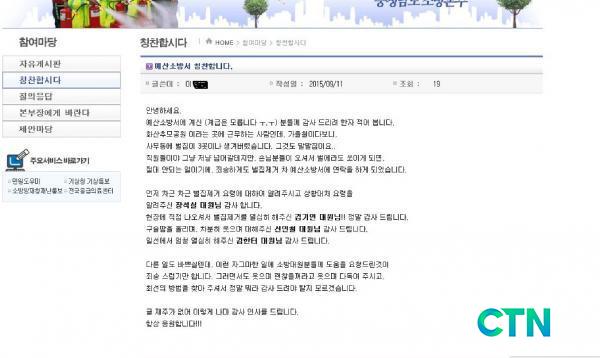 [¿¹»ê/ctn] ÃÖ¿ë°ü ±âÀÚ = ¿¹»ê¼Ò¹æ¼(¼Àå ÀÌÀÏ¿ë) Ãæ³²¼Ò¹æº»ºÎ ȨÆäÀÌÁö ĪÂùÇսô٠°Ô½ÃÆÇ¿¡ '¿¹»ê¼Ò¹æ¼ ĪÂùÇÕ´Ï´Ù' ¶ó´Â ±ÛÀÌ °Ô½ÃµÇ¾î, ¼Ò¹æ°ø¹«¿øµéÀÇ ¸¶À½À» µû¶æÇÏ°Ô Çß´Ù.