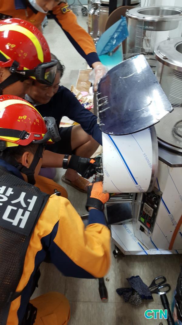 ȯÀÚ´Â ÇÑ¾à Æ÷ÀåÀÛ¾÷ Áß ¼Õ°¡¶ôÀÌ ±â°è¿¡ ³¢¿© ¾ÐÂøµÈ »óȲÀ¸·Î °íÅëÀ» È£¼ÒÇϰí ÀÖ´Â À§ÇèÇÑ »óȲÀ̾úÀ¸³ª Ã⵿ÇÑ ±¸Á¶´ë¿øÀº ºÒ¾È¿¡ ¶°´Â ȯÀÚ¸¦ ¾È½É½ÃŰ°í ±â°è¸¦ µå¶óÀ̹ö¿Í ½ºÆä³Ê¸¦ ÀÌ¿ëÇÏ¿© ºÐÇØÇϰí À¯¾ÐÀåºñ¸¦ ÀÌ¿ëÇÏ¿© ±â°è¸¦ ¹ú·Á ¾ÈÀüÇÏ°Ô ¿ä±¸Á¶ÀÚ¸¦ ±¸Á¶Çß´Ù.