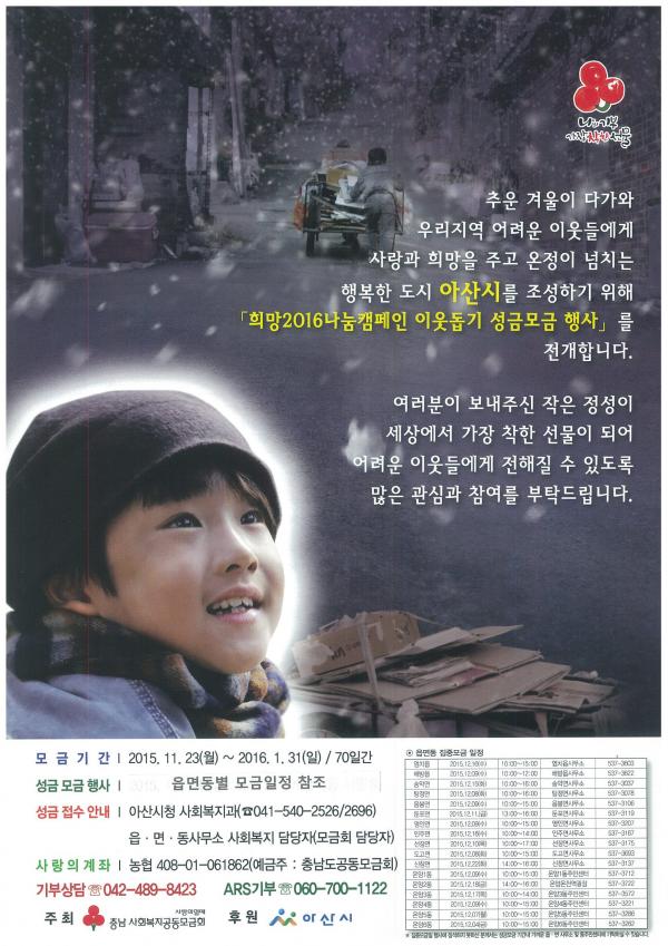[¾Æ»ê/ctn]ÇѼºÁø ±âÀÚ = ¾Æ»ê½Ã(½ÃÀå º¹±â¿Õ)´Â Ãæ³²»çȸº¹Áö°øµ¿¸ð±Ýȸ¿Í ÇÔ²² ÀÌ´Þ 23ÀϺÎÅÍ ³»³â 1¿ù 31ÀϱîÁö 70Àϰ£ 'Èñ¸Á2016 ³ª´®Ä·ÆäÀÎ'¼º±Ý¸ð±ÝÀ» Àü°³ÇÑ´Ù°í ¹àÇû´Ù.