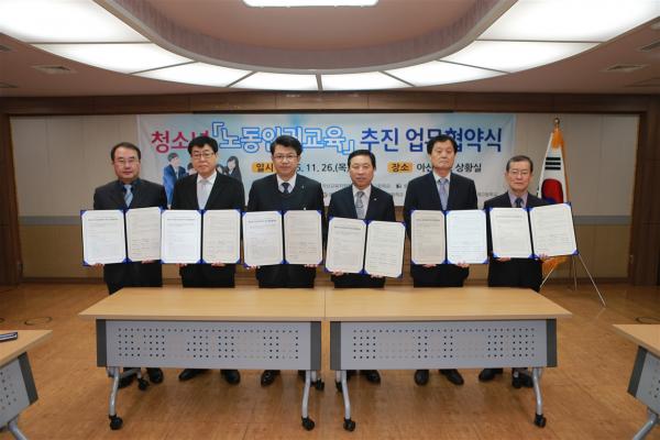 [¾Æ»ê/ctn]ÇѼºÁø ±âÀÚ = ¾Æ»ê½Ã(½ÃÀå º¹±â¿Õ)´Â Áö³ 26ÀÏ ¾Æ»ê½Ãû »óȲ½Ç¿¡¼ Áö¿ª û¼Ò³âÀÇ ³ëµ¿ÀαÇÀ» º¸ÀåÇÏ°í ±ÇÀÍÀ» Çâ»ó½Ã۱â À§ÇÑ 'û¼Ò³â ³ëµ¿ÀαDZ³À° ¾÷¹«Çù¾à'À» ¸Î¾ú´Ù.