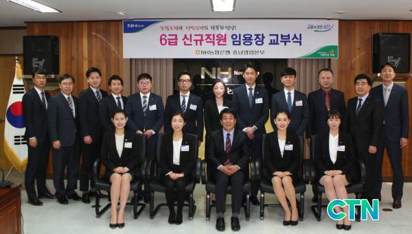 [°æÁ¦/ctn]Á¤¹ÎÁØ ±âÀÚ = NH³óÇùÀºÇà Ãæ³²¿µ¾÷º»ºÎ(º»ºÎÀå À̰½Å)´Â 22ÀÏ Ãæ³²¿µ¾÷º»ºÎ °æ¿µÀü·«½Ç¿¡¼ 6±Þ ½Å±ÔÁ÷¿ø 11¸í¿¡ ´ëÇÑ ÀÓ¿ëÀå ±³ºÎ½ÄÀ» °®°í »õ³»±â Çà¿øÀÇ Ã¹ °ÉÀ½À» ÃàÇÏÇß´Ù.