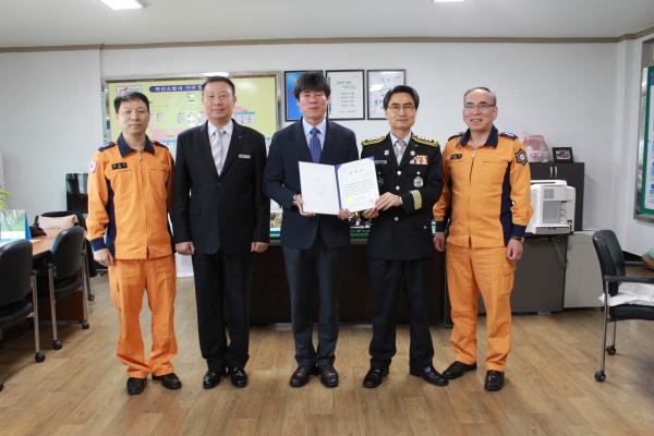 [¾Æ»ê/ctn]ÇѼºÁø ±âÀÚ = ¾Æ»ê¼Ò¹æ¼(¼Àå ÀÌÁ¾ÇÏ)´Â Áö³ 22ÀÏ ¿ÀÀü 10½Ã ¾Æ»ê¼Ò¹æ¼ º»°ü 2Ãþ¿¡¼ (ÁÖ)µµ¸²·ÎÁö½º ¼Ò¹æ¾ÈÀü°ü¸®ÀÚ·Î ±Ù¹« ÁßÀΠȲÁ¤½Ä(³²,46¼¼)¾¾¿¡°Ô ÈÀçÇöÀå À¯°øÀÚ Ç¥Ã¢À» ¼ö¿©ÇÏ¸ç °¨»çÀÇ Àλ縦 ÀüÇß´Ù.