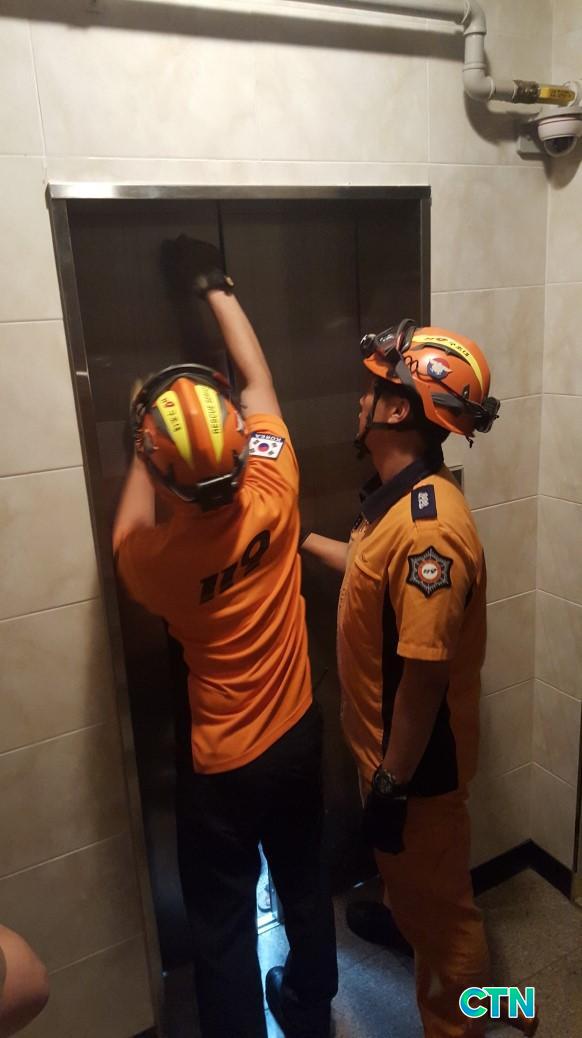 ÇöÀå¿¡ µµÂøÇÑ 119±¸Á¶´ë¿øµéÀº ½Â°±â ¸¶½ºÅÍ۸¦ ÀÌ¿ëÇØ, 2Ãþ¿¡¼ ¸ØÃç °¤Çô ÀÖ´ø ¿¤¸®º£ÀÌÅÍ ³»ºÎ ¿ä±¸Á¶ÀÚ 4¸í(½É◯◯¾¾ ¿Ü 3¸í)À» ¾ÈÀüÇÏ°Ô ±¸Á¶Çß´Ù.