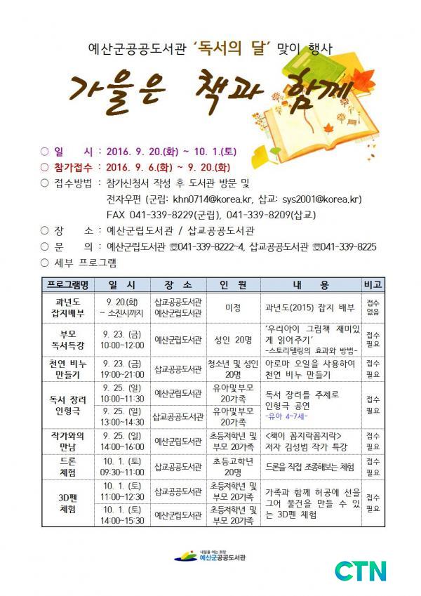 [¿¹»ê/ctn]ÃÖ¿ë°ü ±âÀÚ = ¿¹»ê±º°ø°øµµ¼°üÀº Ã¥ Àбâ ÁÁÀº °¡À», 9¿ù µ¶¼ÀÇ ´ÞÀ» ¸Â¾Æ ¿À´Â 20ÀϺÎÅÍ ¿Â °¡Á·ÀÌ ÇÔ²² º¸°í Áñ±æ ¼ö ÀÖ´Â ´Ù¾çÇÑ µ¶¼¹®ÈÇÁ·Î±×·¥À» ¿î¿µÇÑ´Ù°í 2ÀÏ ¹àÇû´Ù.