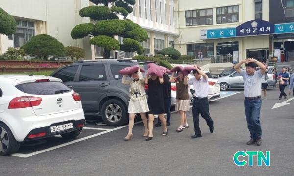 < ¿¹»ê±º ¼Ò¼Ó Á÷¿ø ¹× ÁÖ¹ÎÀÌ ¿¹»ê±º û»ç ±¤Àå¿¡¼ ÁöÁø ´ëÇÇ ÈÆ·ÃÀ» Çϰí ÀÖ´Ù.>