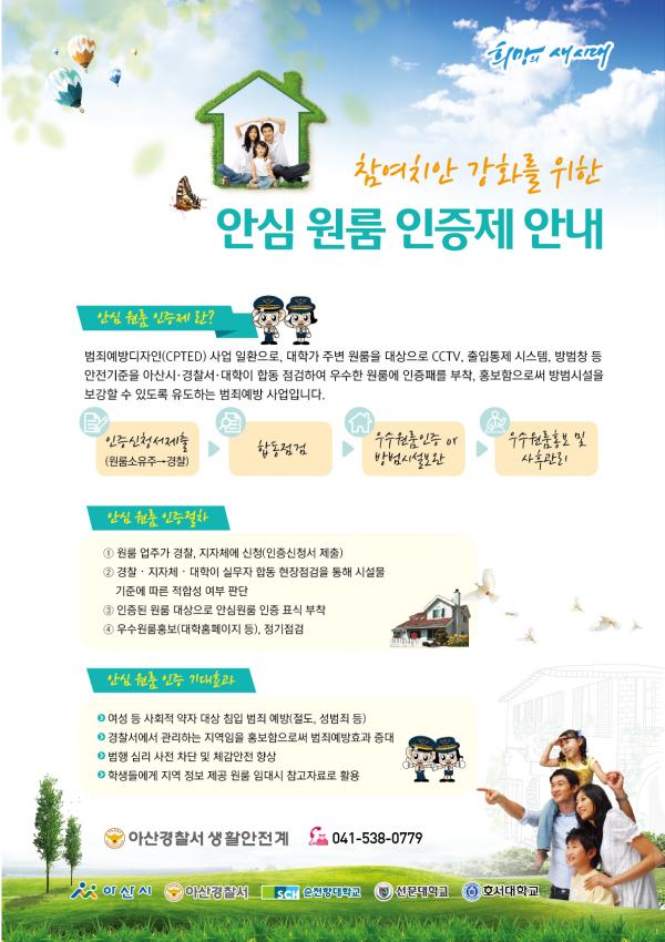 '¾È½É¿ø·ëÀÎÁõÁ¦'´Â CPTED(Crime Prevention Thorough Environmental Design), ȯ°æ¼³°è¸¦ ÅëÇÑ ¹üÁË¿¹¹æÀÇ ÀÏȯÀ¸·Î °æÂû¼¡¤ÁöÀÚü¡¤´ëÇÐÀÌ ÀÎÁõÀ» Èñ¸ÁÇÏ´Â ¿ø·ëÀ» ´ë»óÀ¸·Î ¹æ¹ü½Ã¼³À» ÇÕµ¿À¸·Î Á¡°ËÇÏ°í Æò°¡ ±âÁØ¿¡ ÃæÁ·ÇÑ ¿ì¼ö¿ø·ë¿¡ ´ëÇØ¼´Â ÀÎÁõÇ¥½ÄÀ» ºÎÂø, ȨÆäÀÌÁö µî È«º¸¸Åü¸¦ Ȱ¿ëÇÏ¿© Àû±Ø È«º¸ÇÔÀ¸·Î½á ´Ù°¡±¸ÁÖÅÃ(¿ø·ë)ÀÇ ¹æ¹ü½Ã¼³À» ÁֹΠ½º½º·Î º¸¿Ï¡¤°³¼±À» À¯µµÇÏ´Â Á¦µµ·Î, Æò°¡ ±âÁØÀ¸·Î´Â ¡ã°Ç¹° ÀÔ±¸ ÃâÀÔÅëÁ¦½Ã½ºÅÛ ¡ã¹æ¹ü¿ë CCTV ¡ã¹æ¹ü⠡㠿ܺΠħÀÔ ¿ì·Á Áö¿ª¿¡ ´ëÇÑ ½Ã¼³º¸¿Ï ¡ã Ãß°¡¹æ¹ü½Ã¼³ µîÀÌ´Ù. ½ÅûÀ» ¿øÇÏ´Â ¿ø·ë ¼ÒÀ¯ÁÖ´Â ¾Æ»ê°æÂû¼ »ýȰ¾ÈÀü°è 041)538-0779À¸·Î ¹®ÀÇÇϸé ÀÚ¼¼ÇÑ ÀýÂ÷¸¦ ¾È³»¹ÞÀ» ¼ö ÀÖ´Ù.