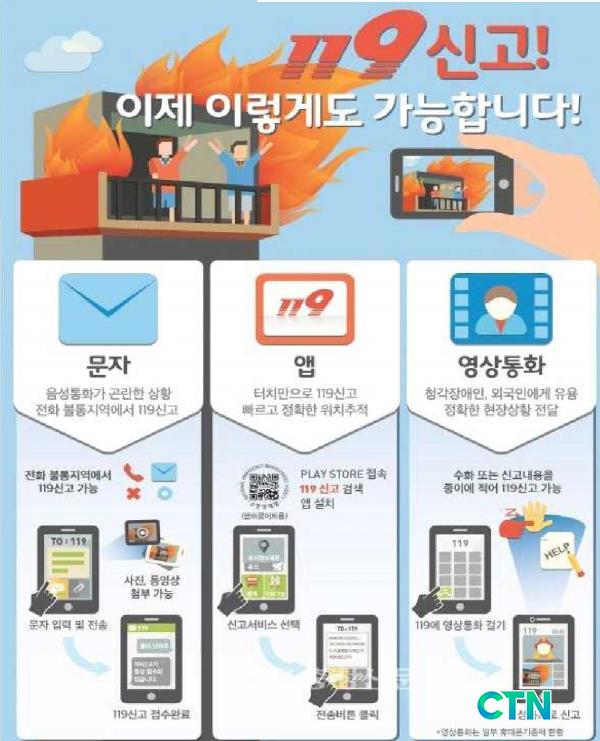 ÀÌ·¯ÇÑ ±Þ¼ÓÇÑ »ýȰȯ°æÀÇ º¯È¿Í ±¹¹ÎÀÇ ¼ö¿ä¿¡ ¸ÂÃç ÈÀç, ±¸Á¶, ±¸±Þ µî °¢Á¾ Àç³ ¾÷¹«¸¦ Ã¥ÀÓÁö°í ÀÖ´Â ´ëÇѹα¹ÀÇ 119°¡ ¿µ»óÅëÈ, ¹®ÀÚ(SMS, MMS), ¾Û(App), ÀÎÅͳÝ(Web)À¸·Îµµ 119¿¡ ½Å°íÇÒ ¼ö ÀÖµµ·Ï 119´Ù¸Åü½Å°í ¼ºñ½º¸¦ Á¦°øÇØ ¾ðÁ¦ ¾îµð¼ ´©±¸³ª ½±°Ô 119¿¡ ½Å°íÇÒ ¼ö ÀÖ°Ô µÆ´Ù.