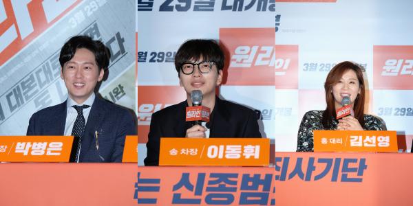 À̳¯ ¾ð·Ð ½Ã»çȸ¿¡´Â ¾ç°æ¸ð °¨µ¶À» ºñ·ÔÇØ ÀӽÿÏ, Áø±¸, ¹Úº´Àº, À̵¿ÈÖ, ±è¼±¿µÀÌ ÀÚ¸®ÇØ Á¨Æ²ÇÑ Ã¹Àλç·Î °£´ãȸÀÇ Æ÷¹®À» ¿¾ú´Ù. ´É±Û¹Ì ³ÑÄ¡´Â »ç±â°èÀÇ »ûº° '¹Î ´ë¸®'·Î ÂøÇÑ ³²ÀÚ À̹ÌÁö¸¦ ¿Ïº®È÷ ¹þ¾î ´øÁø ÀӽÿÏÀº "±âÁ¸¿¡ ¸¹Àº ºÐµéÀÌ ¾Ë´ø ¸ð½À°ú´Â »ç¹µ ´Ù¸¥ ¿¬±â¸¦ Çß´Ù. »õ·Î¿î ij¸¯Å͸¦ ¿¬±âÇÏ¸é¼ ¸ô¶ú´ø ¸Å·ÂÀ» ´À²¼´Ù"¸ç ¿¬±â º¯½Å¿¡ ´ëÇÑ ¸¸Á·°¨À» µå·¯³Â´Ù. 'Àå °úÀå' ij¸¯Å͸¦ ÈǸ¢È÷ ¼ÒÈÇØ³½ Áø±¸´Â "°¨µ¶´ÔÀÌ ´É±¸··ÀÌ °°Àº ij¸¯Å͸¦ ¿øÇϼż, ±×·± ¸ð½ÀÀ» Ç¥ÇöÇÏ·Á ³ë·ÂÇß´Ù. ÇöÀå¿¡¼ ½ºÅǵéÀÌ ²Ù¸çÁØ ¼¼Æ®, ¼Òǰ, ÀÇ»óµé ´öºÐ¿¡ ¿¬±âÇϱ⠱²ÀåÈ÷ ÆíÇß´Ù"¸ç ¸ðµç °øÀ» ½ºÅǵ鿡°Ô µ¹¸®´Â ÈÆÈÆÇÔÀ» ¿¬ÃâÇß´Ù.
