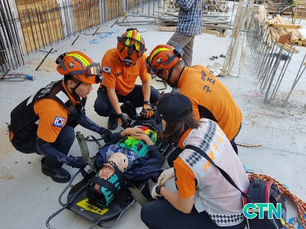 À̳¯ »ç°í´Â ¿¹»êÀ¾ ¿¹»ê¸® ½ÅÃà °Ç¹° °ø»çÀå¿¡¼ ÀÛ¾÷µµÁß 3m¾Æ·¡ ¹Ù´ÚÀ¸·Î ¶³¾îÁø ȯÀÚ¸¦ 119±¸±Þ´ë¿øÀÌ ÇöÀåÀÀ±Þóġ ½Ç½Ã ÈÄ, µé°Í¿¡ °íÁ¤ÇÑ µÚ °ø»çÀå Å©·¹ÀÎÀ» ÀÌ¿ëÇÏ¿© Áö»óÀ¸·Î ¾ÈÀüÇÏ°Ô ±¸Á¶ÇÏ¿© Àα٠º´¿øÀ¸·Î À̼ÛÇß´Ù.