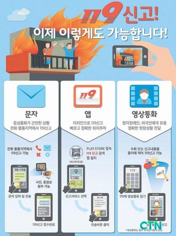 ¶Ç,¹®ÀڽŰí´Â 119 ¹øÈ£·Î ¹®ÀÚ ÀÔ·Â ÈÄ Àü¼ÛÇÏ¸é ½Å°í°¡ Á¢¼öµÇ¸ç, »çÁø°ú µ¿¿µ»ó ÷ºÎµµ °¡´ÉÇÏ´Ù.¶Ç ½º¸¶Æ®Æù ¾Û(App)½Å°í´Â '119½Å°í¾Û'À» ´Ù¿î¹Þ¾Æ ¼³Ä¡ ÈÄ ½Å°í¼ºñ½º¸¦ ¼±ÅÃÇØ Àü¼ÛÇϸé GPSÀ§Ä¡Á¤º¸°¡ 119»óȲ½Ç·Î Àü¼ÛµÅ ½Å°íÀÚÀÇ Á¤È®ÇÑ À§Ä¡ È®ÀÎÀÌ °¡´ÉÇÏ´Ù.