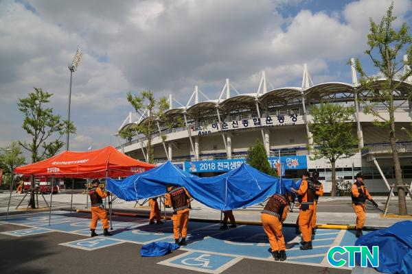À̳¯ ÈÆ·ÃÀº ¿À´Â 10ÀÏ ~ 13ÀÏ(4Àϰ£ ÁøÇàµÇ´Â 2018 Àü±¹»ýȰüÀ°´ëÀü ½ÇÁ¦»óȲ´ëºñ ÈÆ·ÃÀ¸·Î »çÀü´ëÀÀü°è¸¦ È®¸³Çϱâ À§ÇØ ÁøÇàµÆÀ¸¸ç, À̼ø½ÅÁ¾ÇտÀå¿¡¼ ¹æÈ·Î ÀǽɵǴ ÈÀç°¡ °Ç¹° Àüü·Î È®´ë µÅ ´Ù¼öÀÇ »ç»óÀÚ°¡ ¹ß»ýÇÑ »óȲÀ» °¡Á¤ÇÏ°í ½Ç½ÃµÆÀ¸¸ç ÈÆ·Ã ½ÃÀÛ°ú µ¿½Ã¿¡ ¾Æ»ê¼Ò¹æ¼ ÇöÀå Ȱµ¿´ë¿ø°ú ±ä±Þ±¸Á¶ÅëÁ¦´ÜÀº °¢ ¹Ýº°·Î ÁÖ¾îÁø °íÀ¯ÀÇ ÀÓ¹«¸¦ ¼öÇàÇϸç ÈÆ·ÃÀ» À̾°¬´Ù.