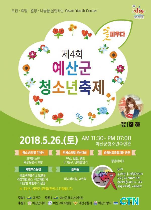 ¿¹»ê±ºÀÌ ÁÖÃÖÇÏ°í ¿¹»ê±ºÃ»¼Ò³â¼ö·Ã°üÀÌ ÁÖ°üÇÏ´Â À̹ø ÃàÁ¦´Â '²É ÇÇ¿ì´Ù'¶ó´Â ºÎÁ¦¸¦ °¡Áö°í 4ȸ° ÁøÇà ÁßÀ̸ç, û¼Ò³âµéÀÌ Æò¼Ò ÇнÀÀ¸·Î ÀÎÇÑ ½ºÆ®·¹½º¸¦ ÇØ¼ÒÇϰí Àç´É°ú ³¢¸¦ ÆîÄ¡´Â û¼Ò³â ¹®È °ø°£À» ¸¸µé°íÀÚ ¸¶·ÃµÆ´Ù.