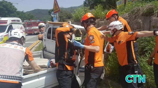 119±¸Á¶´ë¿ø ¹× ±¸±Þ´ë¿øÀÌ »ç°íÇöÀå¿¡ µµÂøÇßÀ» ½Ã ½Âȹ°Â÷°¡ µµ·Î ¿· È뺮¿¡ ½Âȹ°Â÷°¡ Ãßµ¹ÇÏ¿© ¿îÀüÀÚ°¡ Â÷·® ¾È¿¡¼ ³ª¿ÀÁö ¸øÇϰí ÀÖ´Â »óȲÀ̾ú´Ù.