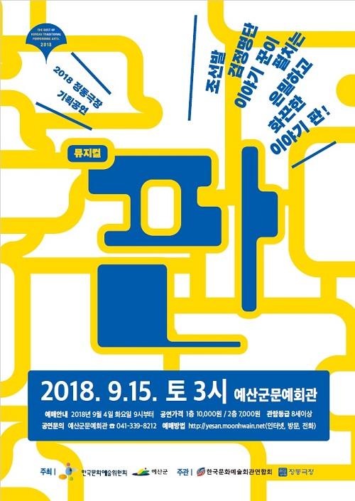 [¿¹»ê/ctn]ÃÖ¿ë°ü ±âÀÚ = ¿À´Â 9¿ù 15ÀÏ ¿ÀÈÄ 3½Ã ¿¹»ê±º¹®¿¹È¸°ü¿¡¼ 2018³â ¹®¿¹È¸°ü°ú ÇÔ²²ÇÏ´Â ¹æ¹æ°î°î ¹®È°ø°¨»ç¾÷ ±¹°ø¸³ ¿¹¼ú´Üü ¿ì¼ö°ø¿¬ ÇÁ·Î±×·¥ °ø¸ð»ç¾÷À¸·Î ¼±Á¤µÈ Á¤µ¿±ØÀå âÀÛ¹ÂÁöÄà 'ÆÇ' °ø¿¬À» ÇÑ´Ù°í ¹àÇû´Ù.