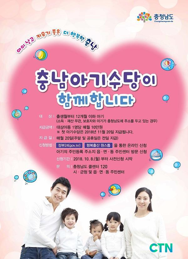 Ãâ»ê°ú ¾çÀ°¿¡ µû¸¥ °æÁ¦Àû ºÎ´ãÀ» °æ°¨Çϰí '¾ÆÀÌ ³º°í Ű¿ì±â ÁÁÀº Ãæ³²'À» ¸¸µé±â À§ÇØ ÃßÁøµÇ´Â Ãæ³²¾Æ±â¼ö´ç ½Åû´ë»óÀº ¼ÒµæÀ̳ª Àç»ê »ó°ü¾øÀÌ º¸È£ÀÚ¿Í ¾Æ±â°¡ ¼Ãµ±º¿¡ Áֹεî·Ï µÇ¾îÀÖ´Â °æ¿ì·Î 2017³â 11¿ù 1ÀÏ ÀÌÈÄ Ãâ»ýÇÑ ¾Æ±âºÎÅÍ ½Åû´ë»óÀÌ µÈ´Ù.