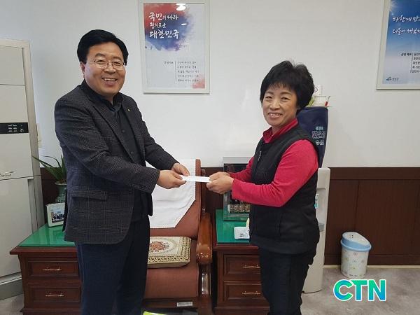 <Á¤»ê¸é ±¤»ýÈ÷ ³Ãõ ¹Ì³ª¸® ´ëÇ¥ À̼±¿ë¾¾ ºÎÀΠȲ¿µ¼÷(»çÁø ¿À¸¥ÂÊ)¾¾°¡ Á¤»ê¸éÀå½Ç¿¡¼ »ç¶ûÀÇ ÈÄ¿ø±ÝÀ» Àü´ÞÇϰí ÀÖ´Ù>
