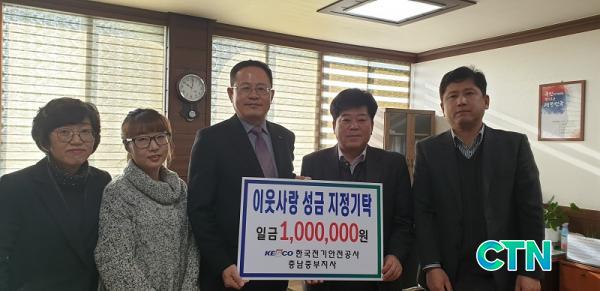 [¿¹»ê/ctn]ÃÖ¿ë°ü ±âÀÚ = Çѱ¹Àü±â¾ÈÀü°ø»ç Ãæ³²ÁߺÎÁö»ç(Áö»çÀå Á¶¼º¸¸)°¡ 17ÀÏ ¿À°¡¸éÇàÁ¤º¹Áö¼¾ÅÍ(¸éÀå ¾ç½ÂÁÖ)¿¡ '»ç¶ûÀÇ ¼º±Ý ¹× »ýÇÊǰ'À» Àü´ÞÇß´Ù.